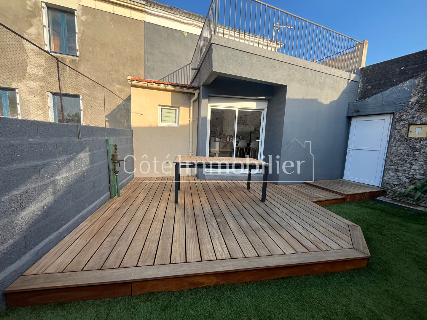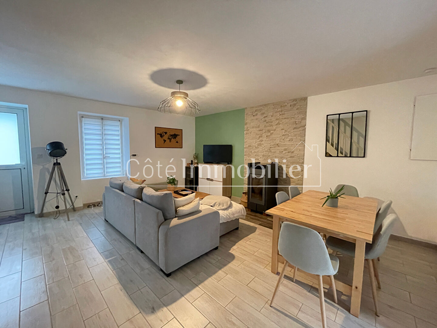 COTE IMMOBILIER BOUAYECoup de coeur assuréVenez découvrir cette charmante maison de bourg entièrement rénovée et à pieds des commodités.Elle comprend une pièce de vie avec poêle a granulés avec cuisine ouverte aménagée et équipée le tout donnant sur une belle terrasse en bois et son jardinet a l'abri des regards, un wc avec espace buanderie.Au 1er étage, un palier sur parquet dessert une chambres avec sa terrasse de 16m², un espace nuit de 8.86m² et une salle d'eau.Au deuxième étage , un bureau pouvant servir de chambre également.La maison dispose également d'un grand garage de 32m².Vous serez séduits.COTE IMMOBILIER - BOUAYE2 PLACE DES ECHOPPES44830 BOUAYE02.40.32.68.88www.cote-immobilier.com (3.43 % d'honoraires TTC à la charge de l'acquéreur.)